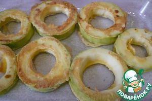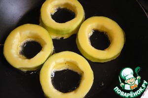 Кабачки очистить, удалить семена, нарезать кольцами.