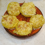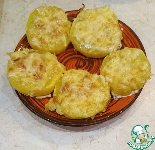После того, как кабачки перевернули, в пустую серединку каждого кружочка залить сметанную смесь. Посыпать сверху сыром.