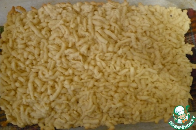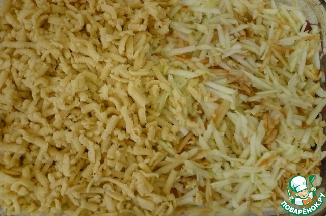 Вынимаем 1-ю часть теста и натираем ее на крупной терке на дно формы. Поставить на 5 мин. в духовку при t=200*C, для просушки первого слоя. -