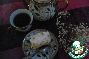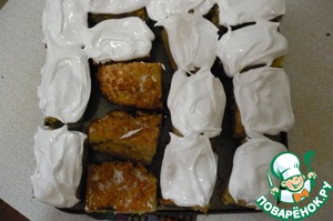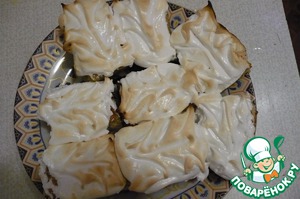 Теперь кусочки переносим на противень, на небольшом расстоянии. Ложкой или из кондитерского шприца наносим безе на верх.