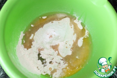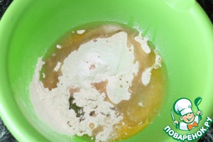 Взбиваем желтки, добавляя в них муку, разрыхлитель, ванилин и растительное масло, всё перемешиваем. -