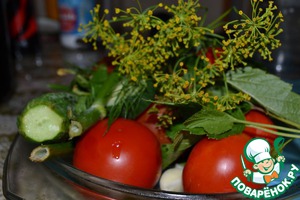Огурцы хорошо помыть, замочить на 2-3 часа. Помидоры, зелень также хорошо промыть.