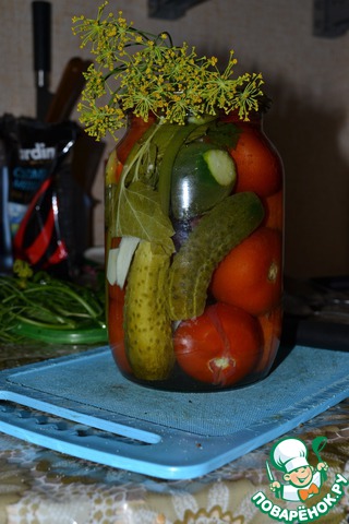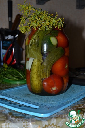 Банку помыть и прогреть над паром 10 минут. Крышки также прокипятить. Когда остынет, сложить в банку овощи и специи. У огурцов я срезаю кончики. Когда все упаковано в банку, залить овощи кипятком, прикрыть крышкой и поставить в кастрюлю с кипящей водой на стерилизацию - 10 минут для банки 1 л. (15 минут для 3 л.)