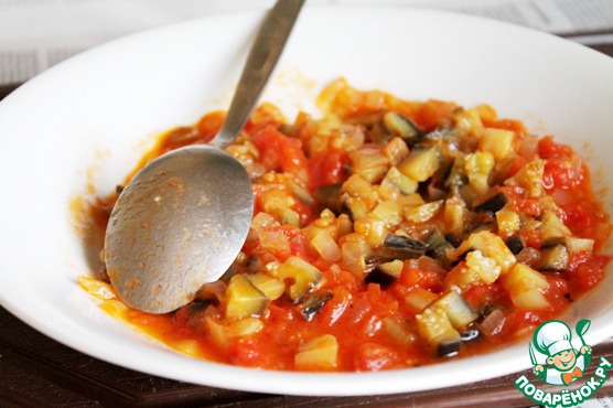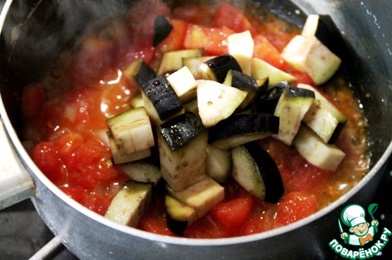 Добавить баклажаны и протушить ещё 10 мин. Если жидкости станет мало, добавить немного воды.