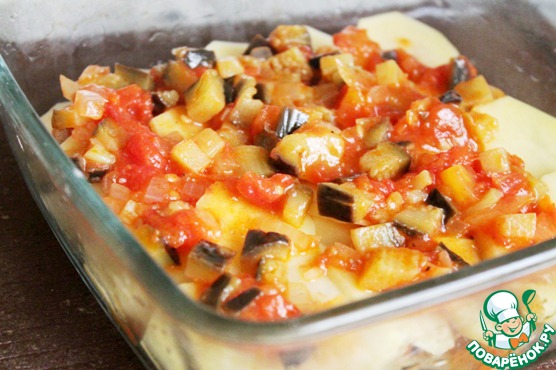 Сверху выложить часть тушеных баклажанов. Затем снова слой картофеля, слой тушеных баклажанов, еще один слой картофеля. Каждый слой картофеля солить и перчить.