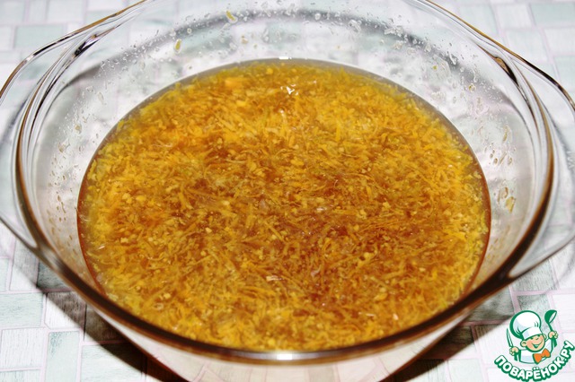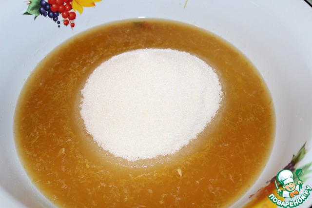 Цедру залить отжатым соком и засыпать коричневым сахаром, отставить на час настаиваться. -