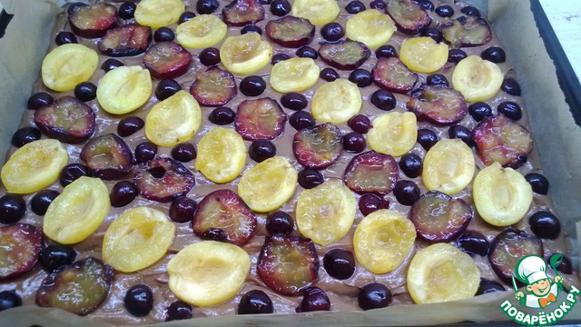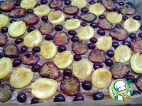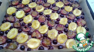 Выкладываем наши фрукты. Сливы и абрикосы шкуркой вниз. Вишни между сливами и абрикосами. Рекомендую - сливы и абрикосы, брать потверже. |
