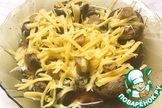 Начиняем наши шляпки шампиньонов начинкой, затем начиненные грибы посыпаем потертым сыром и выкладываем на противень для выпекания, предварительно смазанный под. маслом. На противень, куда выложили грибы, киньте 3 зубчика чеснока.