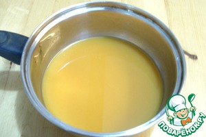 Пока выпекается основа пирога, желатин замочить в холодной воде (8 гр) на 10 минут, апельсиновый сок (200 гр) нагреть почти до кипения, снять с огня, добавить отжатый (если листовой) желатин, перемешать смесь до полного его растворения. Оставить смесь немного остыть.