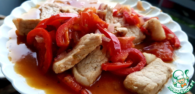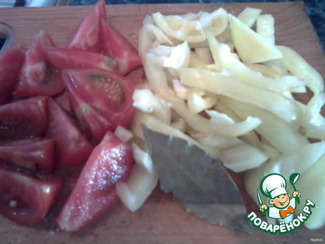 Когда мясо будет почти готово, добавить сладкий перец, помидоры, лавровый лист. Пусть мясо покипит ещё минут 15