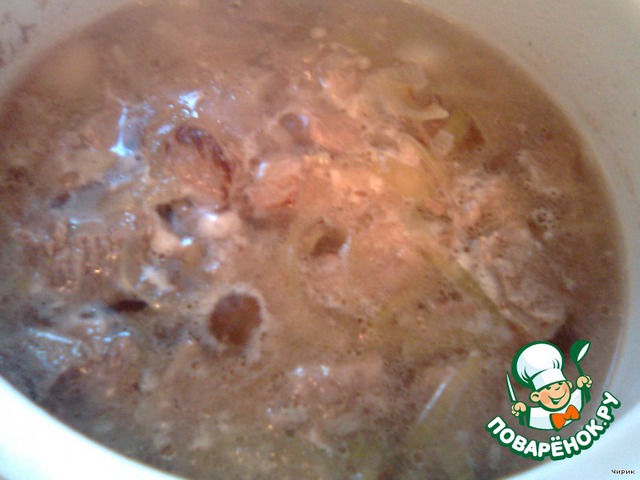 Затем мясо с луком сложить в кастрюлю, добавить кипячёной воды, накрыть крышкой и тушить почти до готовности на слабом огне
