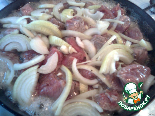 Обжарить на растительном масле лук с мясом минут 10, добавить соль, специи