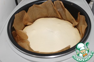Кастрюлю мультиварки выложить пергаментом для более удобного изъятия готовой ватрушки, и утрамбовать основу из песочного теста.