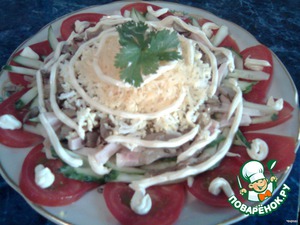 Залить готовое блюдо майонезом, украсить листьями петрушки. Я делала для красоты в виде горки, а вообще можно слоями выкладывать на блюдо или перемешать как обычный салат.
