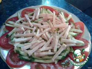 Помидоры вымыть и нарезать кружочками, огурцы - соломкой, ветчину - соломкой