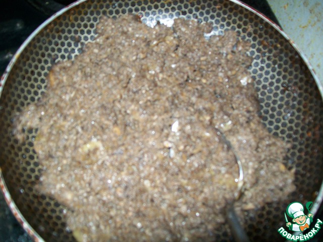 После того, как выпарится вся жидкость, солю и добавляю специи по вкусу. Уменьшилось больше, чем в два раза. Раньше я сначала отваривала грибы, а потом измельчала, но так возни больше. А вообще, кому как нравится, главное, чтоб получилась однородная кашеобразная масса.