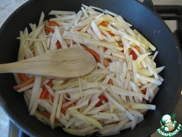 На хорошо разогретую с растительным маслом сковороду выложить овощи. Разровнять лопаточкой и слегка придавить. (Я отступила от рецепта и добавила еще порезанный соломкой болгарский перец!).