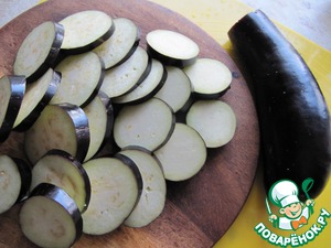 Нарезать баклажаны на кружки толщиной 5 мм и посыпать солью и перцем.