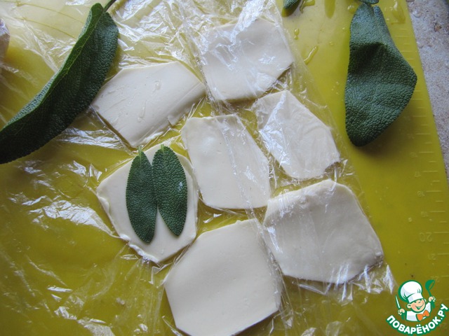 Сливочное масло нарезать пластинками тонкими и положить на каждый листочек шалфея, накрыть пленкой, отправить в холодильник на 10 минут до застывания масла.
