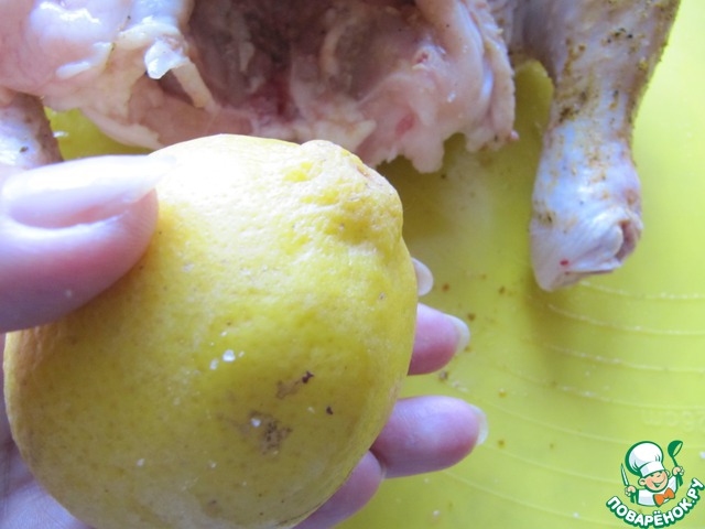 Когда птица будет готова, вынуть лимон, разрезать пополам и выжать лимонное пюре на предварительно разрезанную на куски курицу (если не любите кислинку в мясе, этот шаг можно пропустить!).