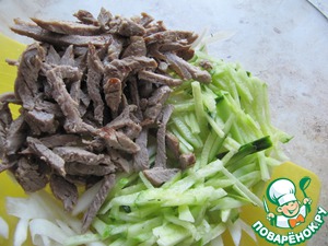 Порезать соломкой либо натереть на терке. Слегка присолить и оставить минут на 10. Потом слить образовавшуюся жидкость, соломка стала более нежной.