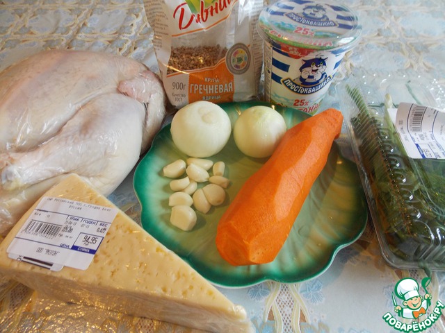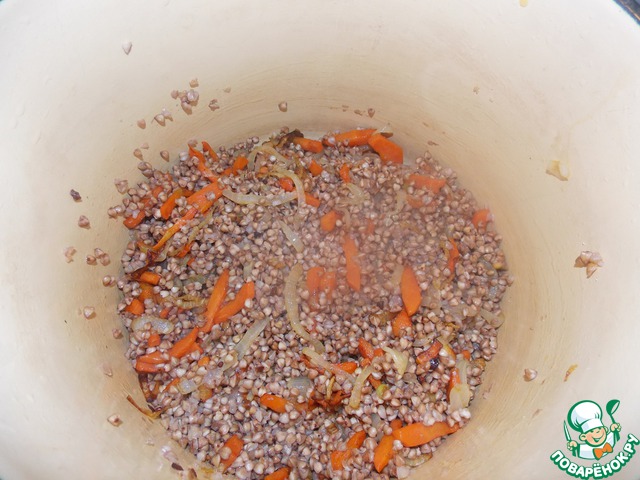 Гречу отварить в 1 стакане воды ( до неполной готовности), лук нарезать полу- кольцами, морковь соломкой и измельчить пару зубчиков чеснока, обжарить все овощи минут 5-10. Затем гречку и овощи смешать, это будет наша начинка.