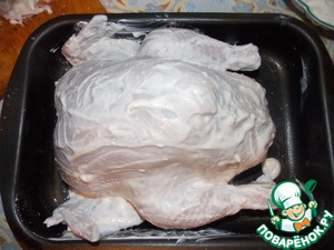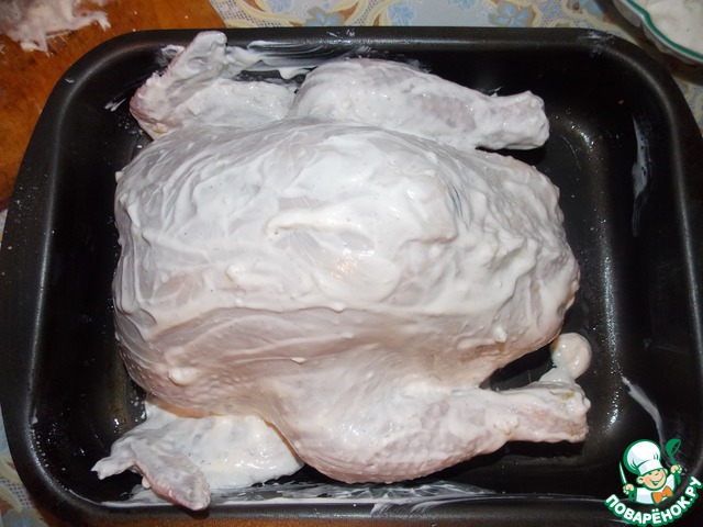 Смазываем курицу соусом сверху и ставим в духовку на 1.5-2 часа при температуре 180 гр.