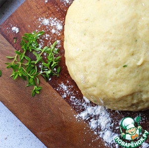 Сыр, масло и яйцо взболтать вилкой до однородности. Добавить соль, разрыхлитель, муку и измельченный тимьян (или розмарин). Быстро замесить тесто, использовать ложку или просто руками, лучше обойтись без миксера. Тесто будет очень мягкое, податливое и совершенно не липнущее к рукам. Оставить в холодильнике на полчаса-час.