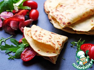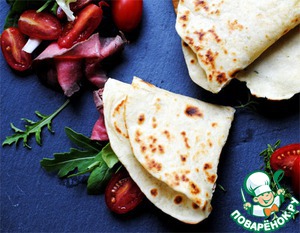 У меня лепешки были с холодным ростбифом, салатом, помидорами и простым винегретом (горчица-масло-винный уксус-мед). Приятного аппетита!