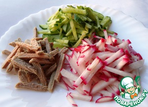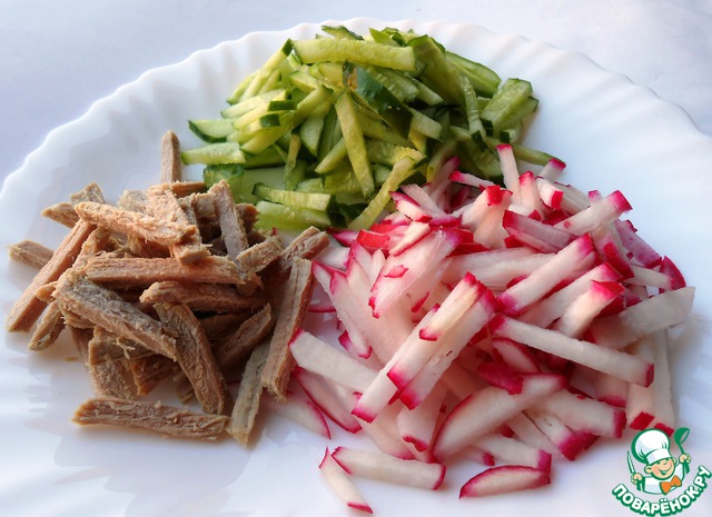 Огурцы, редис и вареную говядину нарезать соломкой.