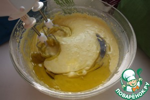 Возвращаемся к нашему тесту - добавляем молоко, затем постепенно мучную смесь, взбиваем.