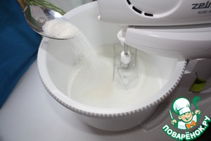 Продолжаем взбивать и добавляем тонкой струйкой обычный и ванильный сахар.