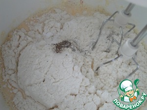 Вмешать туда муку, соль, перец, пекарский порошок.