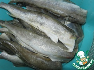 Очищаем от внутренностей, отрезаем голову и хвост, промываем под струей холодной воды. Если рыба крупная, разрезаем пополам, солим.