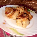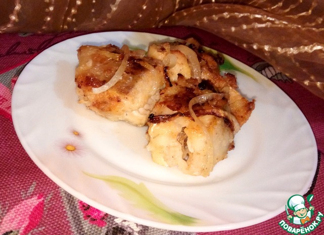 Как только вторая сторона начнет обжариваться и появится золотистая корочка, посыпаем луком так, чтобы он лежал между кусочками наваги.