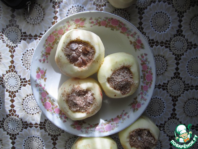 Сложить в тарелку изюм, корицу, измельчённый миндаль, сахарную пудру. Перемешать. Нафаршировать полученной смесью яблоки.