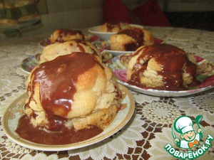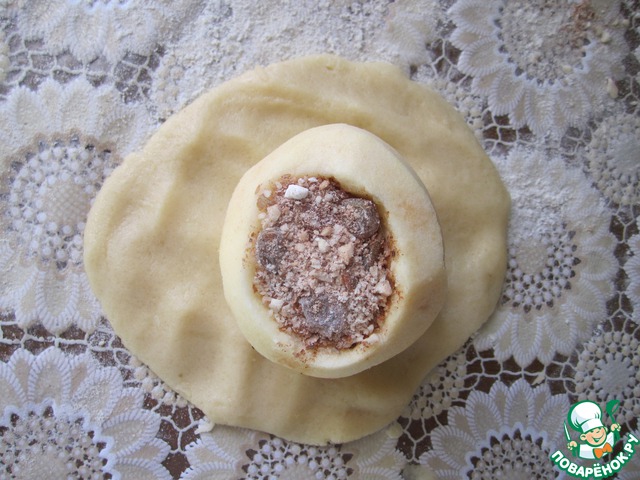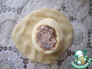 Завернуть в каждый раскатанный кружочек одно яблоко.