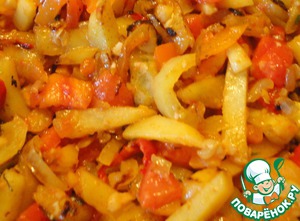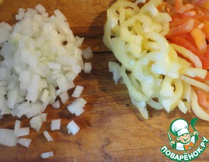 Сначала подготавливаем все овощи. Лук режем кубиками или полукольцами, перец - полосками.