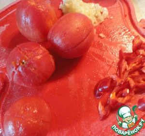 Чеснок мелко рубим ножом. Помидоры надрезаем крестообразно, заливаем кипятком на 1-2 минуты. Снимаем шкуру. Перец чили режем соломкой. Если не хотите сильно острого или готовите для детей, чили не добавляйте.