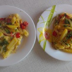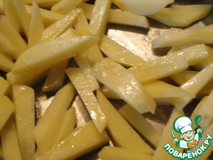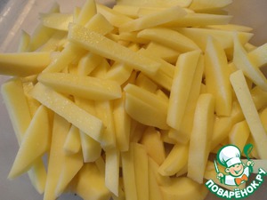 Картофель в разных рецептах предлагалось порезать по разному: соломкой, пластинами, кубиками. Я выбрала соломку.
