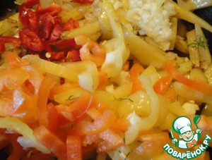 Добавляем перец. Болгаский и чили, а также чеснок. Перемешиваем и жарим вместе около 5 минут.