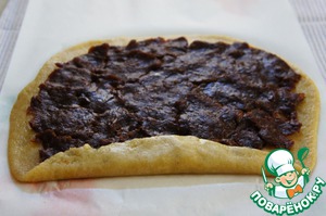 Раскатайте тесто в прямоугольник размером 20*40 см. Распределите по прямоугольнику финиковую пасту, отделяя пасту кусочками и руками разминая до желаемой толщины. Толщину теста и финиковой пасты я делаю одинаковым и чуть толстеньким, по нашему вкусу. Вы можете делать все намного тоньше, тогда печенье будет меньше размером и изящнее. Сформируйте рулет.