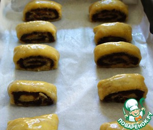 Отправьте рулет на некоторое время в холодильник, чтобы его было легче нарезать. Острым ножом нарежьте рулет на кусочки шириной 1,5-3 см. Выложите их на противень, застеленный промасленной пергаментной бумагой, смажьте поверхность яйцом.