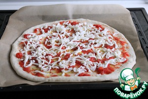 Готовое тесто тонко раскатываем, выкладываем на противень, застеленный пекарской бумагой. Тесто нужно обязательно потыкать вилочкой, иначе пойдет буграми. Тесто смазать том. соусом и полить небольшим количеством оливкового масла. В приготовлении данной пиццы можно использовать как готовый том. соус так и просто пассерованные томаты. У меня был второй вариант, я их немного посыпала солью, перцем и суш. базиликом.