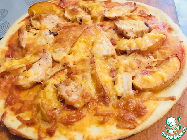 Идею для этой пиццы я почерпнула из рекламного буклета, который нам подкинули в почтовый ящик (оказывается, полезно иногда в них заглядывать). Называлась данная пицца Chicks & Peach, поэтому название я сохраняю. Ну что же еще написать? Это просто нужно пробовать! На самом деле, очень вкусная пицца, необычный дуэт курицы и персика. Если Вы любите интересные вкусовые сочетания, то мой рецепт точно для Вас.