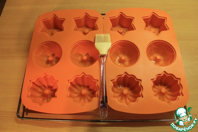 Запекала в силиконовых формочках, ничем не смазывая при 170° 30 минут.