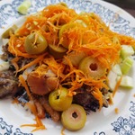 Выложить в глубокую посуду. Добавить порезанные кружочками оливки (или огурец малосольный), порезанный стебель сельдерея, корейскую морковку.