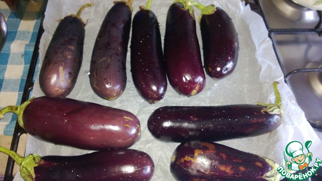 Количество продуктов может быть любым, зависит от вашего вкуса, я люблю, когда много баклажанов. Вымытые баклажаны (плодоножку оставляем) выкладываем на противень, предварительно положив на него пергаментную бумагу.