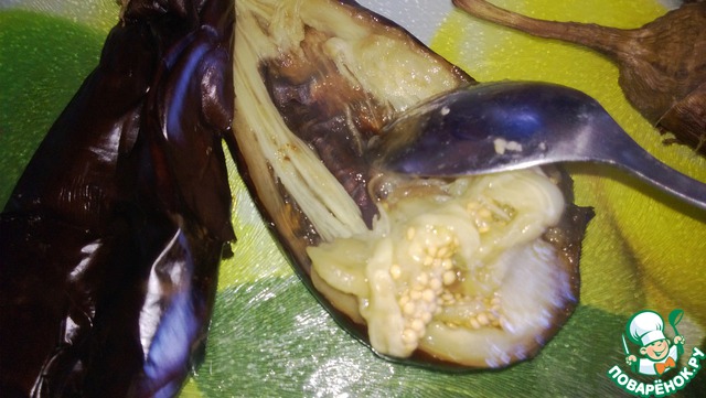 Готовые баклажаны, разрезаем вдоль и ложкой вычищаем мякоть. Кстати, если разрезав, вы поняли, что баклажан еще не готов, отправляйте его обратно в духовку. У меня были не одинаковые баклажаны и они были готовы не одновременно. Когда баклажан готов, мякоть очень легко отделяется от шкурки.