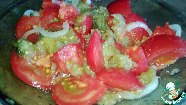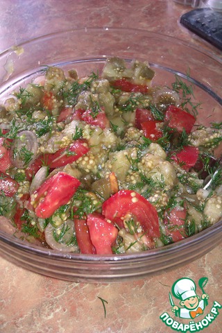 Режем крупно помидоры, шинкуем полукольцами лук, соединяем с баклажанной массой, добавляем масло, соль. Салат готов. Приятного аппетита!